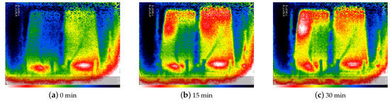 The IR thermograms of the phone screen surfaces at the start of the tests after 15 and 30 min were obtained. The test phone is on the right while the control phone is on the left of the IR images presented in this section.