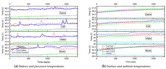 As shown in Figure 6a, for the less power-intensive tasks (call, video, music), for which the casing protects the user’s hands from elevations in back surface temperatures, internal temperatures (processor and battery) also increased, which may be detrimental to the internal electronic components of the devices.