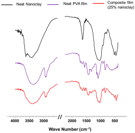 The FTIR spectrum of PVA/nanoclay composite film is presented in Figure 1. The spectrum is dominated by peaks that are characteristic of both PVA and nanoclay. The peak at 3395 cm−1 could be attributed to the overlapping of OH stretching of both PVA and nanoclay.