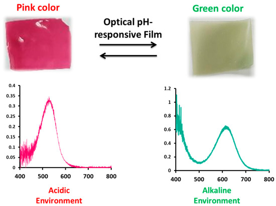There is a growing demand for the development of smart-responsive packaging films for tracking the freshness of food products, enhancing safety, and improving the quality of packaged food during storage, transportation, and distribution [1,2]. Smart optical pH-responsive films for food packaging represent one of the most attractive research areas in this field. The pH of the packaged items is prone to change during long storage or microbial spoilage of the packed food products (e.g., fish, meat, and fresh pork sausages) due to pH change in the local microenvironment that surrounds the packed food items. Hence, a variety of colorimetric pH indicators immobilized on different polymeric matrices has been employed for optical sensors for detecting changes in the pH of the microenvironment that surrounds the packed food items [3].