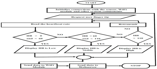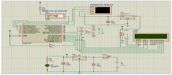 Figure 2 illustrates the schematic diagram of the proposed system architecture using Proteus 8.0 design tools and Arduino Uno integrated design environment [19,20]. In order to demonstrate the concepts of the proposed simulation methodology, a simple heartbeat monitoring and control model was built as shown in Figure 2. This model consists of the power supply; the heart pulse sensor; the microcontroller, ESP8266 WiFi module; liquid crystal display; resistors; capacitors, etc. These components are interconnected to ensure the proper working and functionality of the entire system. Figure 3 illustrates the system flowchart. The flowchart describes the logical steps taken by the implemented algorithm to determine the heartbeat rate of the system’s user. If the read heartbeat is greater than zero and less than 60 bpm, the system displays a message that the heartbeat of the user is low. If the read heartbeat is greater than 60 bpm and less than 100 bpm, the system will display the status message that the heartbeat of the user is stable. Furthermore, if the read heartbeat of the user is greater than 100 bpm, the system will display the status message that the heartbeat of the user is high. The system will loop several times to capture the heartbeat of the user from his/her inserted fingertip on the device prototype.