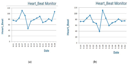 Herein, we present the experimental results obtained from the implemented device prototype. The heart pulse sensor transmits data to the Arduino microcontroller. The microcontroller processed the data and sends it to the LCD screen for display. The data are then transmitted to the ESP8622 WiFi module and from there it is then transmitted to the thingspeak IoT platform through a well-established internet connection. To access the heartbeat data, all you need to do is to log on to your thingspeak.com account and view your data which is visualized and displayed in graphical form. Similarly, the data can be visualized in tabular form with the date and time stamped when the data was captured. An important information to adhere to is that there are various factors that make the heartbeat rate of different people at rest time to differ. As a general case, the average heartbeat rate of an adult at a resting state is said to be at 72 bpm. The heartbeat rate of a child between the ages of 7 to 16 ranges between 70–120 bpm, while the heartbeat range of an adult of ages 17 to 55 ranges between 60 to 100 bpm. Similarly, the heartbeat of older people with their age range from 60 and above, their heartbeat at rest is between 65 to 125 bpm. Other important factors that affect the heartbeat rate are the body size, exercise level of an individual, etc. Figure 4a shows the heartbeat rate of an old man at rest state. We can observe that the heartbeat is fluctuating between 65 to 125 bpm. Figure 4b illustrates the heartbeat rate of an adult at rest state. We can observe that the heartbeat is fluctuating between 60 to 100 bpm. These graphs demonstrate the efficiency and reliability of the proposed approach.