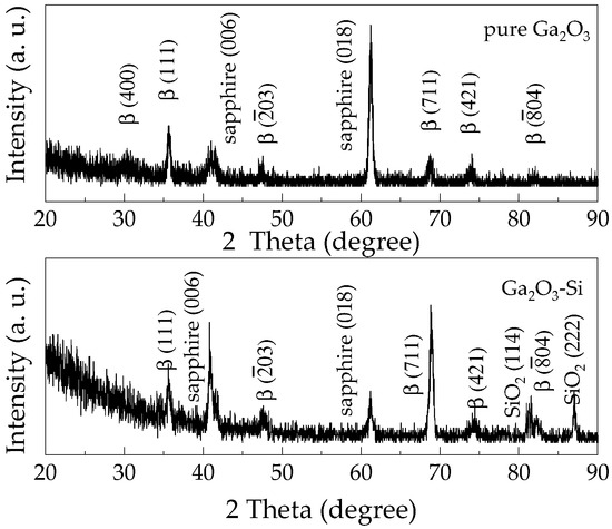 According to XRD analysis, the samples consisted of β-phase gallium oxide polycrystals (Figure 1) [10]. Also, according to XRD, there were two intense peaks associated with sapphire [10,11]. For the Ga2O3–Si films, there were peaks corresponding to SiO2 (114) and (222).
