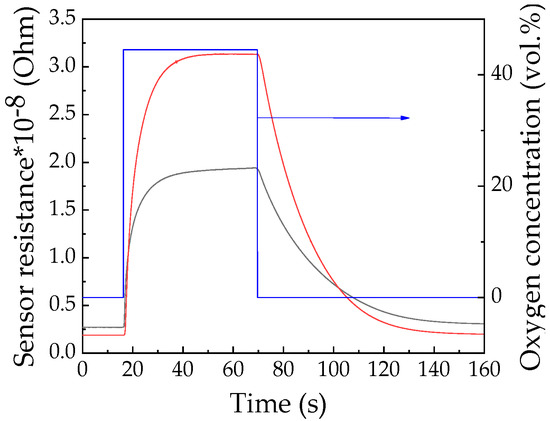 To evaluate the performance of sensors, the response and recovery times were estimated. The response time tres is the time period during which sensor resistance reaches 0.9RSst level after the beginning of oxygen exposure, where RSst is sensor resistance stationary value at 44.5 vol. % of oxygen concentration. The recovery time trec denotes the time interval during which sensor resistance reaches level 1.1R0st, where R0st is sensor’s stationary resistance value in the nitrogen atmosphere. The shortest response time for sensors was observed at T = 600 °C and was 11–13 s. The recovery time was~70–80 s.