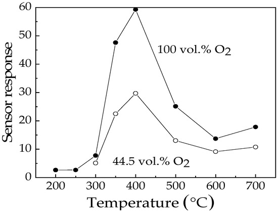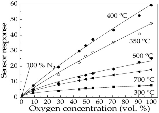 The response of sensors with increasing oxygen concentration rose according to the power law S~Cm at all temperatures chosen for research (Figure 4). The value of the index m depends on the temperature. At a temperature 400 °C m = 0.86 ± 0.02 and at T = 500 ÷ 700 °C m = 0.61 ± 0.04.