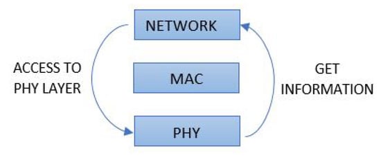 The modification that we made considers three main stages: access to the physical layer from the network layer, obtaining the number of neighbors of the routing protocol, and implementing a periodic update process. For that, it is necessary to establish a link between AODV and the physical layer, which is shown in Figure 1.
