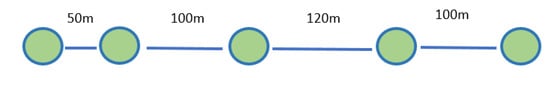We define an ad-hoc network with a group of 5 fixed nodes aligned horizontally separated by variable lengths fulfilling a total length of 370 m in 20 s of simulation. We consider a linear topology because this topology can be applied to real scenarios such as petroleum pipes and orchards []. Node 0 will be the server and node 4 the client, as depicted in Figure 2.