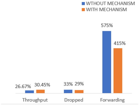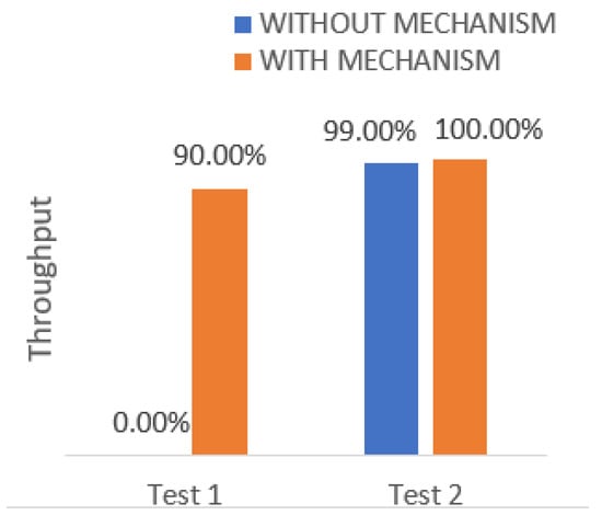 As can be seen, the throughput is noticeably greater when using the power control mechanism in the first test, so the functioning of the designed power control mechanism can be validated. This is because the default transmission power, which is fixed in the “without mechanism” case is not enough to create a link between nodes 2 and 3. In the second test, the throughput obtained without using the power control mechanism achieves an almost ideal transmission; this happens because in the second test, the distance between node N2 and node N3 was reduced to 115 m, distance at which a transmission with minimum losses is possible.
