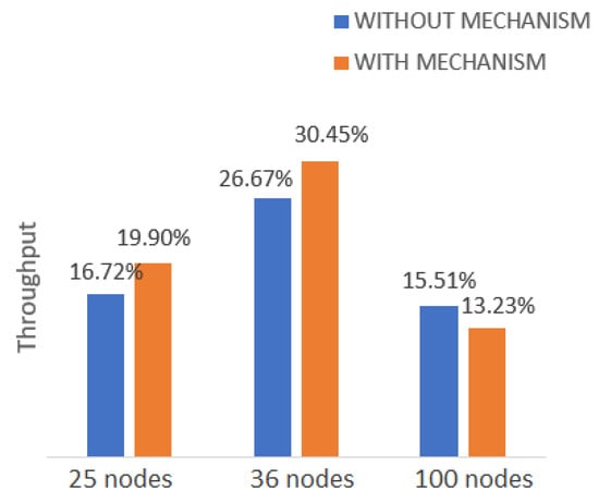 This test analyzes the average throughput level that can be achieved with different density nodes (25, 36, and 100 nodes) and with a nodes’ average speed of 5 km/h. Figure 5 summarizes the results.