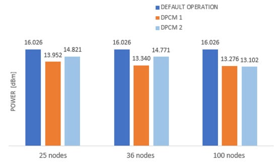 - Power control focused on Network layer: Power control that operates at the MAC layer does not give routing protocols the opportunity of choosing optimal next-hop node. This means that the MAC approach only leads to local optimization of network performance, and hence it is necessary to add transmission power control at the network layer (or higher) to obtain the global optimization []. Authors considering the interaction between power control and network layer propose COMPOW, CLUSTERPOW, and LOADPOW schemes. The difference between these mechanisms with DPCM is that our mechanism depends on the number of neighbors detected.