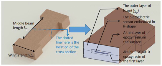 Figure 1 depicts the multi-layered strains sensor used in this work for the SHM of asphalt pavement. The key sensing unit is an 80 mm × 18 mm × 1.55 mm PVDF piezoelectric thin film [13]. To better protect the PVDF thin film, three layers of protection, which respectively are the internal mechanical protection layer, the middle thermal insulation layer, and the outmost corrosion protection layer made by urethane casting resin, are built on the external surface of the PVDF thin film. Regarding the internal mechanical protection layer, the packaging material chosen is Araldite GY-6010 epoxy [5]. According to the material parameter sheet of Araldite GY-6010 epoxy, it has a tensile modulus around 2.67 GPa and high tensile and flexural strengths above 27.56 MPa, which are similar to other epoxies. Its thermal conductivity is relatively lower, generally only 0.2 W·m−1·K−1. In addition, polyurethane foam is chosen as the material for the middle thermal insulation layer due to its excellent thermal insulation performance. The thermal conductivity of polyurethane foam is only 0.022 W·m−1·K−1 [14]. Considering the stress distribution of the sensor embedded underneath the pavement, the H-shape has been adopted in this paper. The thickness of the outer corrosion protection layer is less than 1 mm, which is negligible as compared with the thickness of the other two layers, and it will not be discussed in this paper. The substitute was not included in the analysis.