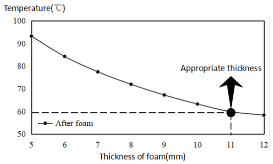 As shown in Figure 3, with the increase of the foam thickness, the output temperature drops correspondingly. If the desired output temperature is 333.15 K (60 °C), the minimum thickness of the foam should be 11 mm. It can be clearly seen from Figure 4 that the output temperature decreases dramatically after the thermal insulation layer (foam layer).