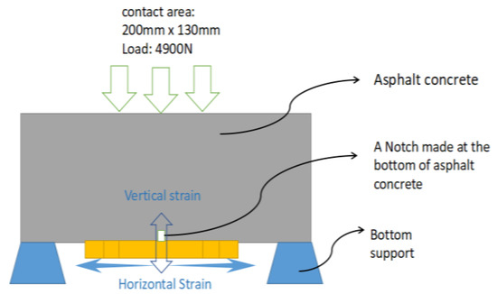 In this simulation, a three-point bending test is utilized to analyze the sensor design. As shown in Figure 5, two concrete supports are used at both ends of the bottom of asphalt pavement beam. The size of the asphalt concrete is 300 mm × 130 mm × 100 mm. The thickness of the asphalt equals 100 mm, cited from Alavi, A.H.’s study [16]. A force of 4.9 kN is applied to the middle region of the asphalt pavement beam’s top surface, with a contact area of 200 mm × 130 mm. In other words, the overall pressure applied on the top of the beam is about the pressure of a tire on the ground of an ordinary car.