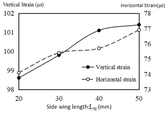 Figure 6 shows that with the increase of the wing length, LW, both the vertical and the horizontal strain increases. However, when the wing length, LW, increases to 50 mm, the vertical strain curve begins to flatten and it stabilizes at around 101 µε. Meanwhile, the horizontal strain first shows a gentle trend and then shows a sharp upward trend. Therefore, according to the variation trend of the water vertical strain curve, 50 mm can be determined as the suitable width of the wing. After determining the width of the wing, the simulation began to change the length of the center beam, LC, with a fixed side wing length, LW. The simulation results are shown in Figure 7; by increasing the length of the center beam, the two strain curves increase gradually until the length of the center beam, LC, reaches 160 mm. After 160 mm, the horizontal strain basically does not change, but the vertical strain curve drops slightly in the range of 160 mm to 180 mm. Then both the vertical strain and the horizontal strain show a peak at 190 mm. When the length reaches 200 mm, the two curves decrease sharply, indicating that the performance of the H-shape cannot be guaranteed. As such, the final decision is to use 160 mm as the length of the final center beam. In other words, the optimal ratio of the center beam length (160 mm) to wing length (50 mm) is Section 3.2.