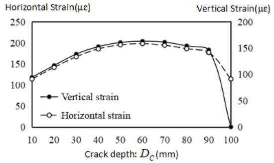 The simulation results of crack detection are shown in Figure 8. It can be clearly seen from the figure that when the notch depth increases to 50 mm, the two strain curves reach their peaks. From 50–90 mm, these two curves drop slightly. After 90 mm, the strain value begins to decline. Therefore, it can be concluded that the H-shape can detect the state of the crack by observing the vertical strain or the horizontal strain.