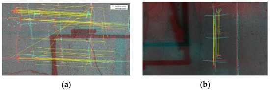 Figure 6a shows the application of the SURF algorithm. In order to reduce the noise of corresponding features between two successive points, the M-estimator sample consensus (MSAC) algorithm was used. This algorithm is a robust estimation procedure for finding the transformation matrix between sets of images. As it is visible in