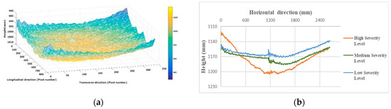 Figure 7a,b are showing the stitched images along the road and the transverse profile, which visualizes three different types of rutting.