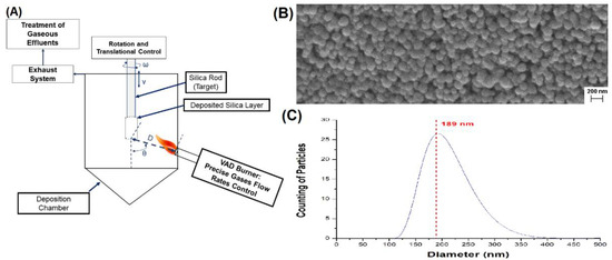 (A) Schematics of the VAD system with the main processes parameters; (B) SEM image of silica nanoparticles; (C) Size distribution of particles (average diameter of 189 nm).