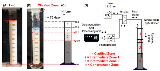 Test tube containing the colloidal silica: (A) First day of experiment; (B) 73 days after the beginning of sedimentation; (C) 4 different sedimentation zones that could be distinguished on day 73. Each zone presents a different value of particles concentration, creating an environment where it is possible to simulate concentration disturbances (heights expressed in cm units); (D) optical fiber sensor (OFS), used for evaluating the concentration disturbances.