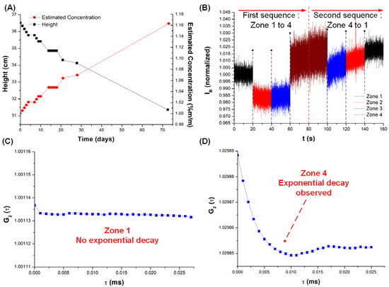 (A) Average values of the heights verified for the two tubes and concentrations estimated from Equation (3) (secondary vertical axis); (B) sequential step disturbances on the concentration of the OFS probe; (C) G2(τ) obtained for Zone 1; (D) G2(τ) obtained for Zone 4, with an exponential decay.