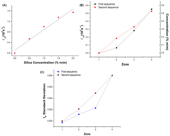 In order to assess the concentration in each zone, a calibration curve was obtained by calculating Γm for suspensions with a known concentration of silica, Figure 4A. The linear correlation of the experimental data (Γm = 0.78288C + 0.10898, C in % m/m, R2 = 0.95942), yielding 0.78288 × 103 s−1 sensitivity. Figure 4B shows the Γm calculated for each zone and the concentration obtained with the calibration curve, and Figure 4C shows the standard deviations σ of the signals in each zone.