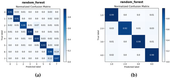 Random Forest confusion matrices. The accuracy of each state out of 8 labels with the stairs division according to the labels in Table 1 (a) and out of 4 labels (b) for only the main smartphone modes (1—swing, 2—pocket, 3—talking, 4—texting).