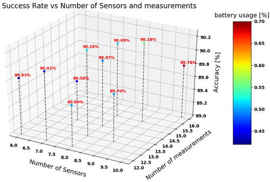 Sensors and measurement reduction. The accuracy of the classifiers as a function of number of sensors and phone measurements used. The color represents the battery usage percentage of the specific sensor subset used in the classification process. The power consumption was evaluated with the number of sensors and their average power consumption [10,11].