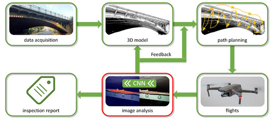 Based on these challenges, the project InÜDosS (InÜDosS—“Inspektion, Überwachung und Dokumentation von stahlbaulichen Strukturen”—Inspection, monitoring and documentation of steel constructions) was initiated to automate monitoring, inspection, and documentation of steel constructions. Figure 1 shows the interconnection of the different stages in our automatic monitoring approach. The scope of the project InÜDosS covers different aspects that arise in the process of monitoring steel structures with UAVs. This includes data acquisition and 3D model reconstruction, automatic path planning, and image analysis. In this paper, our focus was on the aspect of automatic image analysis (outlined in red).