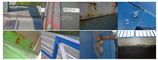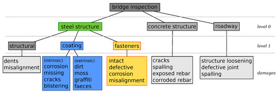 The special nature of the image data gathered demands a custom approach to tackle the problem. Field inspection images at hand show great variety concerning characteristics of the structures being investigated (cf. Figure 2), as well as the level of detail. Depending on the distance between the UAV and the examined object, the different types of damages only add to the complexity of the problem. Our approach is based on a hierarchy on a conceptual level, as displayed in Figure 3, which we directly transfer to our computational method. The proposed hierarchy consists of two stages. At the first stage, we aim to identify relevant structures. Roughly speaking, this comprises all (coated) supporting steel structures. If such a structure is identified, it will then be analyzed for damages. At the second stage, we consider two main categories of potential damage: coating damages and faulty fasteners. Coating damages are further subdivided into blistering, cracks, missing coating, and corrosion. Fasteners can be intact, defective (e.g., loose nuts), tilted, missing, or corroded.
