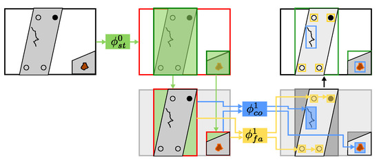 The first network () is trained to recognize coated steel structures, resulting in bounding boxes of recognized structures. These bounding boxes are used as regions of interest (ROI) to restrict networks of the second stage. In the second stage, we run two separate networks, one for coating damages () and the other for fastener damages ().