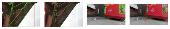 For the simple version, we applied the trained model of the given category on the corresponding test dataset as is common practice. In this case, the detector was simply applied to the whole image. Figure 5b shows IOUs on image level for a test set of 70 images. The cascaded version shows an improvement of 9% compared to the plain version. Figure 6 shows detection results for coatings and fasteners. Red boxes indicate detection results for the first stage (steel constructions), while green boxes and outlines show results of the second stage (coating or fasteners).