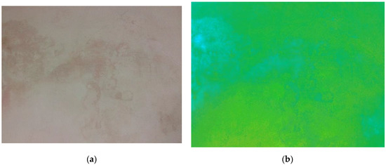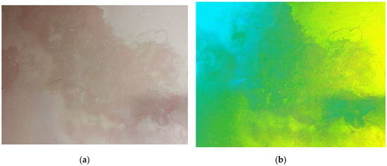 Figure 2a,b show typical image without leaks acquired from both the PI camera and the thermal camera module, respectively. It is seen that the two different cameras were utilized to acquire images in a same location. Further, the acquired thermal image using the thermal camera module was taken for further processes. Also, the Figure 3a,b show typical image with leaks acquired from both the PI camera and the thermal camera module, respectively. The 100 train images with and without leaks were acquired with the thermal camera module at different locations were utilized to train SVM classifiers. Also, 50 test images were acquired using the thermal camera module, in which 25 images were with leaks and 25 images were without leaks.