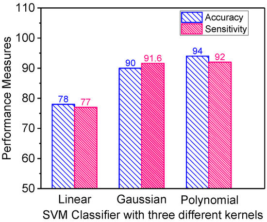 Figure 4 shows the performance measures of SVM classifier with three different kernels such as Linear, Gaussian, and Polynomial (order = 8). It is seen that the accuracy and sensitivity of SVM classifier with polynomial kernel is higher when compared to the other SVM kernels. Also, it is observed that the SVM classifier with Gaussian kernel has very good sensitivity (91.6%), almost similar to the SVM classifier with Polynomial kernel. Therefore, the SVM classifier with Polynomial kernel is utilized to design an automated decision support system since it has good performance measures when compare to other SVM classifiers. The performance measures, namely accuracy and sensitivity of SVM classifier with three different kernels are presented in Table 1. It is seen that the accuracy and sensitivity of the adopted SVM classifier with polynomial kernel (order = 8) is 94% and 92%, respectively. It is also observed that the performance of an SVM classifier can be improved by increasing various train images.