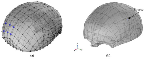 (a) Position of the sensors where the acceleration produced by the pressure inside the skull was evaluated. (b) Simulated volume and pressure source.