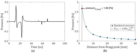 Because most of the energy was deposited in a volume that had a depth of approximately 2 mm, it was necessary to propagate the pressure from the simulation of different points in the space on the beam emission axis. For this, the pressure received simulated by a 5 mm to 40 mm sensor in 5 mm steps was simulated. For this, the expression was used where is a known reference pressure, the distance between the source and the sensor, and the water absorption coefficient. With these, Figure 3 shows the pressure signal received by a sensor 20 mm from the Bragg peak, the maximum simulated pressure values for different distances and a setting that establishes a pressure of 1.66 Pa at a distance of 2 mm.