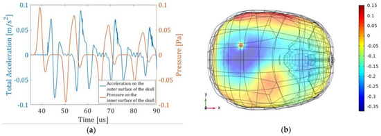 (a) Left axis, signal received on one of the sensors [m/s2] and right axis, pressure on the surface of the skull [Pa]. (b) Signal acoustic propagation in the X, Y plane (units in Pa).