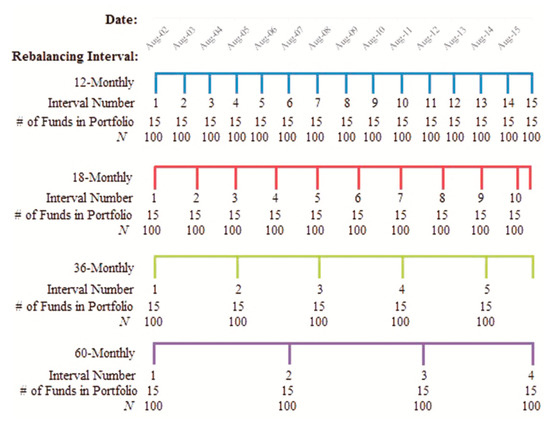 Figure 1 provides an illustration of the rebalancing interval regimes considered in the analysis of this study (e.g., if a fund has lost its previous 5-star rating at the time of rebalancing, it will be replaced by a randomly selected fund from the 5-star category).We adopt four different rebalancing intervals as follows: 12-, 18-, 36-, and 60-month rebalancing intervals throughout the overall sample period to examine the performance of portfolios formed using ratings based on either Morningstar or the EU-E models.
