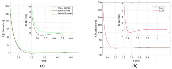 Methane: The FM and the path-space force matching (PSFM) methods at equilibrium. (a) The FM pair force with linear and cubic B-splines, and Lennard–Jones parametrizations. (b) The PSFM reproduces the FM method, [16].