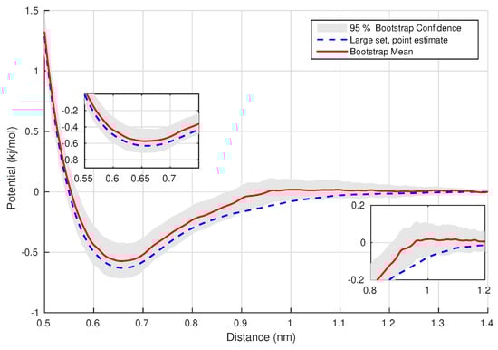 The model system consists of 96 polyethylene chains of 99 monomer units ( ), i.e., . The simulations were performed under NVT conditions at temperature . For the coarse-grained representation we consider a 3:1 mapping representation, i.e., three monomer units form one CG particle. With this application we study the effect of the size of the available observations (system configurations), and quantify uncertainties due to the small number of observations. Figure 4 depicts the derived FM potential for a large set of observations. In addition, shows the confidence set obtained with a statistical analysis resampling technique (bootstrap method) of a small observations set, which captures the large-set outcome.