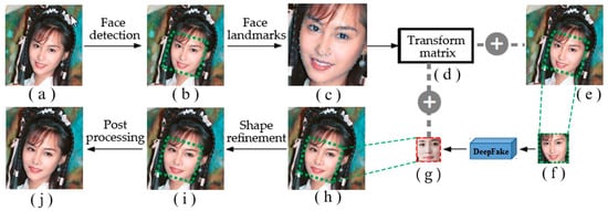 Figure 1g–h). This will result in two different image compression ratios between the fake face area as the foreground and the original area as the background, which would leave obvious artifacts.