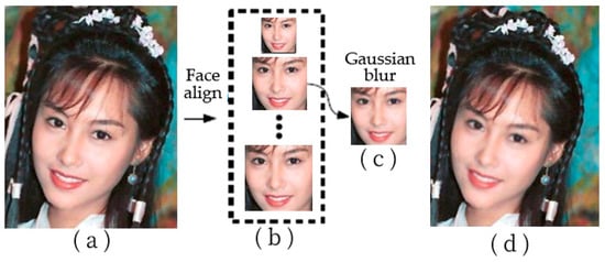Figure 2: First, we detect faces in the original image, extract face landmarks from each detected face area, and calculate the transform matrix according to the landmarks. Then, we apply Gaussian blur to the adjusted face. According to the inverse of transform matrix, the face is wrapped back to the original angle and cover on the original face.