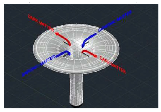 Using the cavitation and Navier–Stokes 3D equations we can explain the production of dark matter in black holes and especially in the event horizon, see Figure 1. This risky conjecture has the support of the advances made in the first photo of a black hole and its correspondence with Einstein’s gravitation equations. In addition, it is categorically demonstrated that Einstein’s equations not only relate to Navier–Stokes’ equations but are equivalent in the event horizon [9,10,11]. Bredberg et al. (2012) probes the respective theorems from Einstein to Navier–Stokes as follows. “The near-horizon expansion in gravity is shown to be mathematically equivalent to the hydrodynamic expansion in fluid dynamics, and the Einstein equation reduces to the incompressible Navier–Stokes equation.”