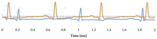 The orange trace represents record named from origin 16273 from MIT-BIH Normal sinus rhythm database, and light blue trace represents record 100 from MIT-BIH Arrhythmia database.