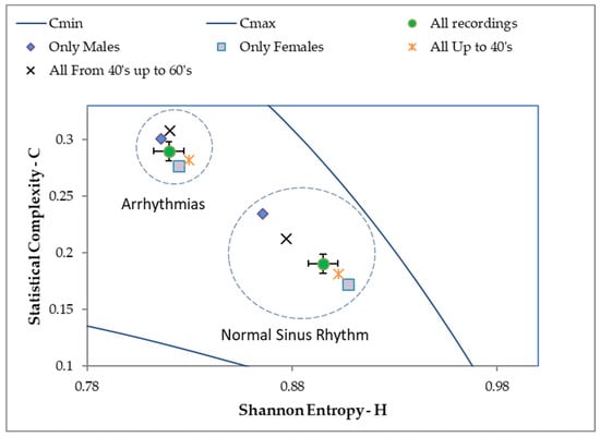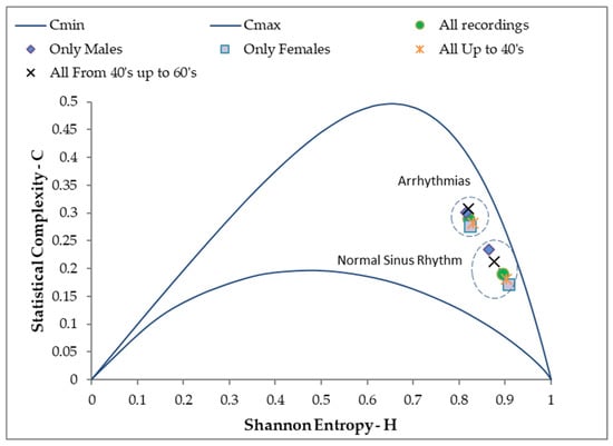 This shows that the signals from patients with normal ECGs have less statistical complexity in their waveform, measured from the divergence of the information of Jensen–Shannon and higher entropy values. This result confirms, as shown in the literature [24], that a normal ECG would be closer to the regions of the entropy complexity plane that usually brings together the dynamic systems called dissipative (by decreasing their n-dimensional volume in the phase space), and that they comprise the systems that develop deterministic chaos (characteristic of the control system of a healthy heart), while an ECG from a patient with arrhythmia is located in a region of the HxC plane that characterizes the so-called k-noise [21] and fractional Brownian motion. This last result indicates that cardiac arrhythmia could occur due to the loss of non-linear control (with the development of deterministic chaos behavior) in the heart, giving way to more disorderly (random) dynamics—typical of the pathology.