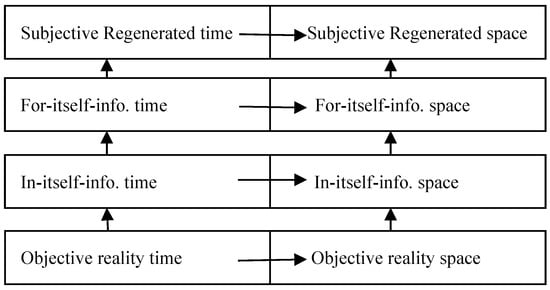 Although modern nature science has described the relationship between time and space from the objective ontological category. Isaac Newton proposed the static space-time view of time and space in 17th century. In 20th century, Elbert Einstein’s relative theory show us the interaction of space and time from the objective existence. While it is only an external unity and transformation, because relativity is a unified relationship under the background of static cosmology [] (p. 200). The concept of “internal time” in Prigogine’s theory of dissipative structure reveals that things have evolved in an orderly direction while absorbing external matter and energy. In the direction of orderly evolution, spatialization of time happens. Space has gained a time dimension, and spatial structure has formed temporal continuity [] (pp. 197–209). The problem is, how does the spatialization of time dynamically change in the objective aspect? Is there any other level of spatialization of time in addition to the cognitive conceptual aspect? This paper attempts to answer the above questions from the perspective of Information Philosophy. As a direct existence state (objective reality existence), time and space should have its transformation process in three other different levels, which means space and time in information-in-itself, information-for-itself and regenerated information [] (pp. 47–57). From this four dimensions, we can explore the theory of spatialization of time more completely.