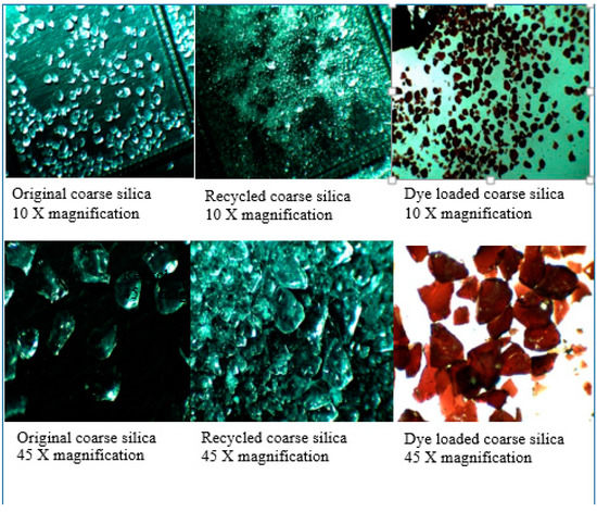 Silica gel—the properties of the silica material used, both pristine and recycled, have been discussed previously [4]. In brief, SEM studies of the original silica gel Merck grade 9385 and of the recycled silica gel Merck grade 9385 (e.g., 5× recycled) show no noticeable difference in size, shape or morphology. This is supported by Brunauer–Emmett–Teller (BET) surface measurements with a BET surface area of 394.5 m2/g for the original silica gel, 387.8 m2/g for 1× recycled silica gel and 422.3 m2/g for 2× recycled silica gel, initially showing a slight decrease in BET surface area, but then a slight increase after the second recycling. The average (adsorption) pore diameter (4 V/A) decreases, however, from 78.5 Å of the original silica gel over 72.7 Å (for 1× recycled silica gel) to 65.9 Å (for 2× recycled silica gel). For the coarse silica gel Aldrich 60742, it was found that the silica crystallites (Figure 1) seem to have been pelletized as the recycling of the silica gel led to the fracturing of these pellets into small pieces (see Figure 2, showing photos taken under the optical microscope). After the pristine silica gel had been recycled once, no further changes in size or shape of the silica particles occurred upon further recycling. It was noted that the dye that penetrated into the pellet along the surfaces of the crystallites may be responsible for fracturing the pellets where released gases during the combustion process exerted internal pressure on the pellet (Figure 1).