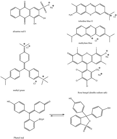 Dyes and stains—we chose the following stains, food colorants and dyes: Methylene Blue, Malachite Green Oxalate, Neutral Red, Toluidine Blue O, Methyl Green, Rose Bengal, Phenol Red, Alizarine Red S, Fast Green FCF, Nitrazene Yellow, Nile Blue, and Rhodamine B (Figure 3 and Figure 4). These dyes and stains were selected as they are some of the most commonly used in educational laboratories.