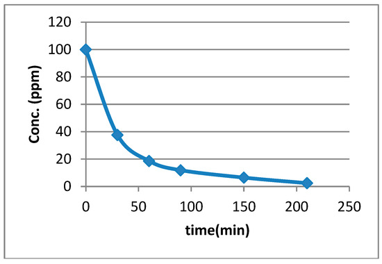 An example of an adsorption study with Neutral Red—Adsorption of most dyes studied on silica gel of Merck grade 9385 (fine, pore size 60 Å, 230–400 mesh) was so rapid that no kinetic studies were performed for most dyes. This allows, however, for the use of silica gel of Merck grade 9385 in the simple and speedy treatment of remnant dye solutions in educational and small research laboratories. The adsorption of dyes on silica gel Aldrich 60742 proceeded more slowly. Here, it was possible to investigate adsorption kinetics. Figure 5 shows the diminishing concentration of the dye Neutral Red in aqueous solution, indicating the time take for the dye to be adsorbed into silica gel Aldrich 60742. The concentration of the dye was seen to decrease from 100 ppm to 37 ppm after 30 min, and to 2.5 ppm after 210 min (3 h and 30 min). We recycled the silica and reused it for another adsorption process without seeing a marked difference in the adsorption behavior of the dye. Using silica gel of Merck grade 9385 in this process under the same conditions saw the concentration of Neutral Red decrease from 100 ppm to between 1.5 and 2.5 ppm within 30 min.