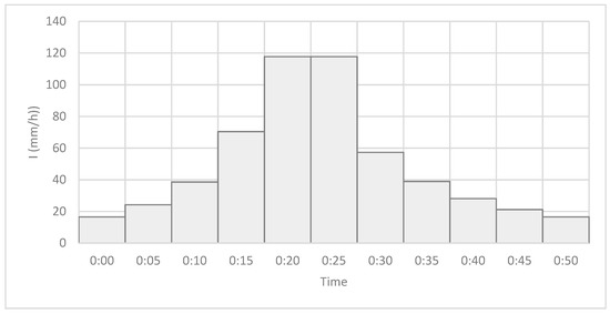 For the analysis, a design storm was used based on an Intensity-Duration-Frequency curve previously defined by Ngamalieu-Nengoue et al. [12] calculated using the alternate block method with 5 min intervals (Figure 2). The design storm was calculated under a climate change scenario [20].