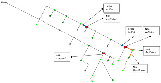 In previous work [12] the optimization of E-chico drainage network was made with a pseudo genetic algorithm considering the replacement of pipes and the installation of STs. The authors considered 5 different scenarios. Scenario 5 offers the best solution and considers the installation of 3 STs and the change of 3 pipes. For this solution, the objective function has a value of 213,981 €. Table 2 shows the results obtained. For this work, series of 50 simulations were performed to different combinations of parameters. The analysis was also performed using a pseudo genetic algorithm. Figure 3 represents the results of the best solution found. The installation of 3 STs on nodes N4, N10 and N23 is required. The renewal of the T02 and T03 pipes is also required, The renewal of pipes 2 and 3 are necessary, with an increase in diameters from 0.40 m to 0.45 m in both cases. Finally, the installation of hydraulic controls on the T04 and T10 pipes is required. The hydraulic controls must generate head losses with a value of 170.